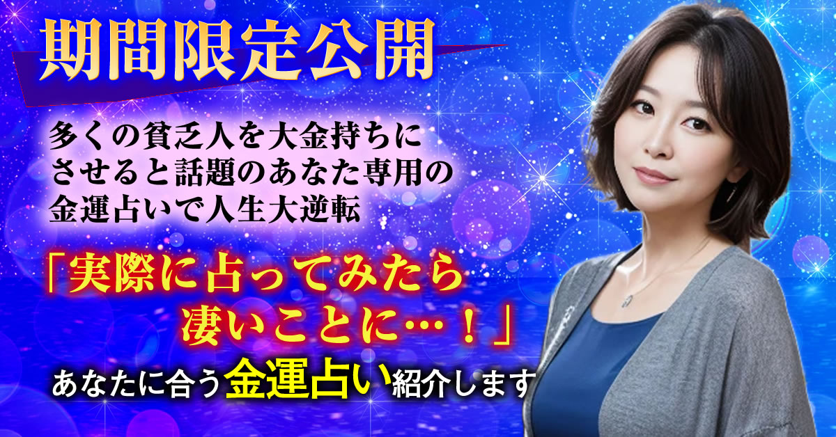 「今回限りのチャンスです!無料であなたに合った本格的な金運占いができますので、人生逆転したい方は是非占ってみてくださいね!」
