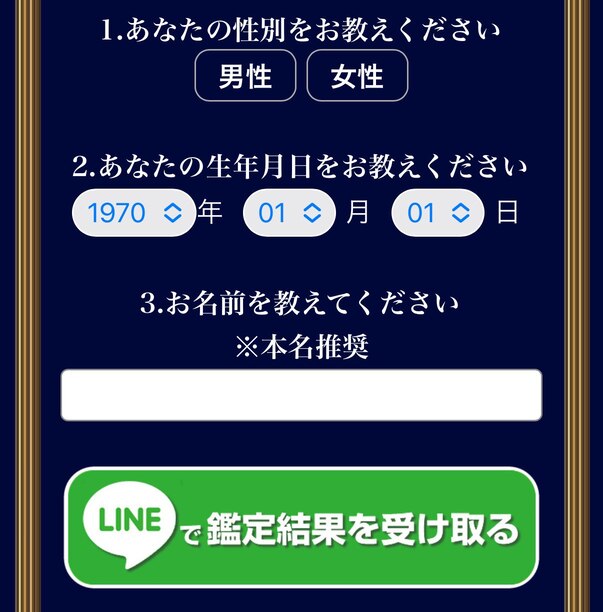 ②サイト内に入って、基本情報【性別、生年月日、名前】を入力後【LINEで鑑定結果を受けとる】をクリック!