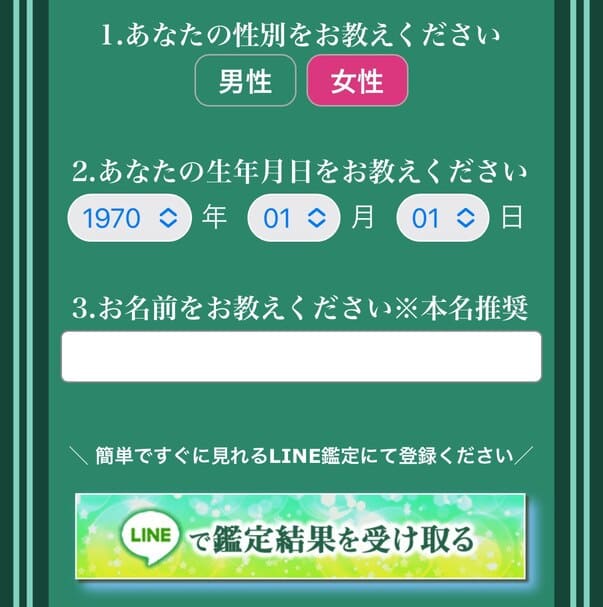 基本情報【性別、生年月日、名前】を入力後【LINEで鑑定結果を受け取る】をクリック!