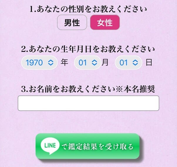 基本情報【性別、生年月日、名前】を入力後【LINEで鑑定結果を受け取る】をクリック!