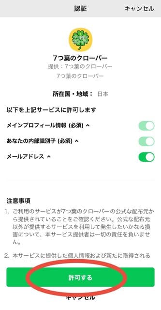 ③【LINE鳳 富美代(7つ葉のクローバー)】で【許可する】→【友だち追加】で完了です!