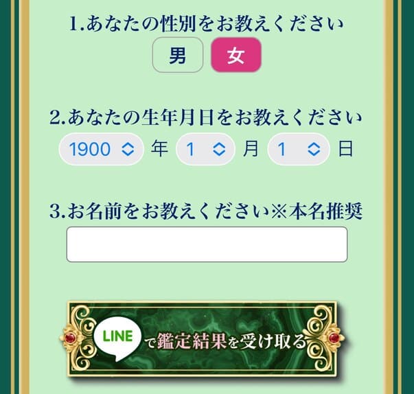 基本情報【性別、生年月日、名前】を入力後【LINEで鑑定結果を受け取る】をクリック!