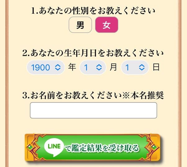 基本情報【性別、生年月日、名前】を入力後【LINEで鑑定結果を受け取る】をクリック!
