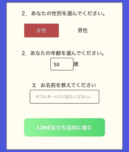 ②サイト内に入って、基本情報【性別、年齢、名前】を入力後【LINE友だち追加に進む】をクリック!