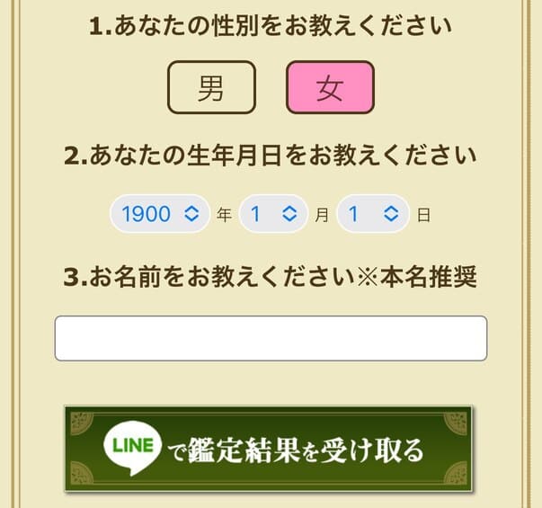②サイト内に入って自分の星座を選択して、基本情報【生年月日、性別、名前】を入力後【LINEで鑑定結果を受け取る】をクリック!