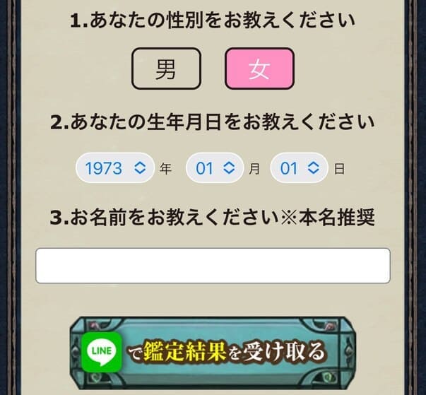 ②サイト内に入って自分の星座を選択して、基本情報【生年月日、性別、名前】を入力後【LINEで鑑定結果を受け取る】をクリック!